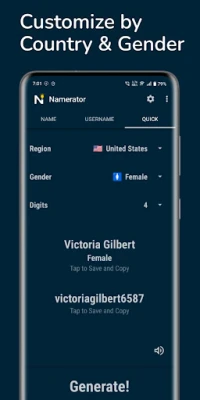 Namerator: Fake Name Generator هو أداتك الأمثل لإنشاء أسماء فريدة ومبتكرة. مثالي للاعبين، الكتاب، ومنشئي المحتوى، يقدم Namerator أفكارًا لا نهائية لأسماء المستخدمين، الشخصيات الخيالية، أو هويات جديدة عبر الإنترنت.